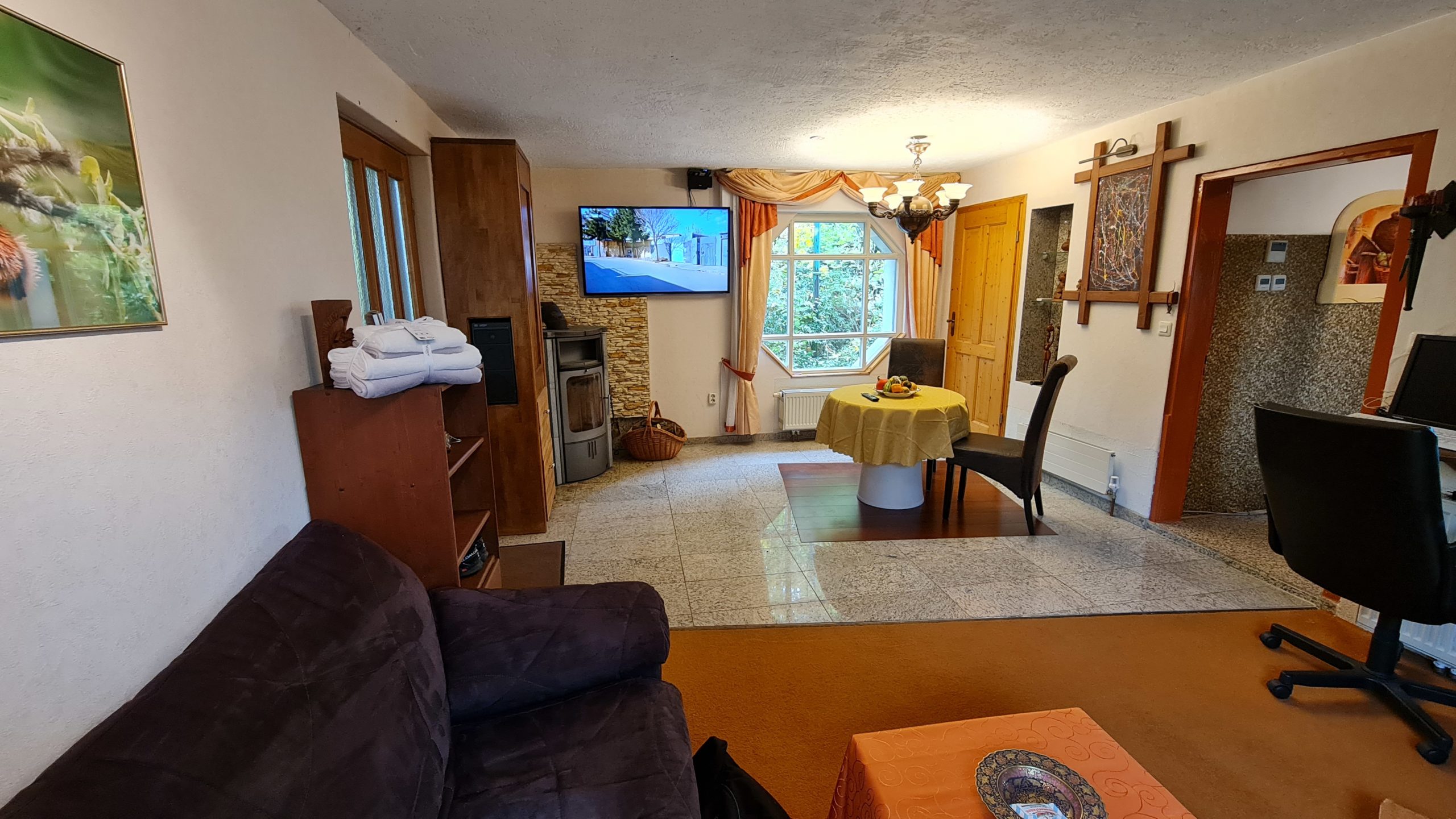 - Ausstattungen: Abdunklung, Aufbewahrung von Kleidung, Babybett, Backofen, Bettwäsche, Bücher und Lesematerial, Duschgel, Erste-Hilfe-Set, Esstisch, Ethernet-Verbindung, Extrakissen und -decken, Feuerlöscher, Gefrierschrank, Geschirr und Besteck, Gesicherte Fenster, Grundausstattung zum Kochen, Heizung, Herd, Hinterhof/Garten, Kaffeemaschine, Kostenloser Parkplatz auf dem Grundstück, Küche, Kühlschrank, Privater Eingang, Rauchmelder, Reinigungsprodukte, Seife oder Duschgel, Shampoo, TV, Warmwasser, Weingläser, WLAN